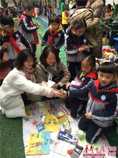 市场中自由买卖,人潮涌动,各种充满童趣的小“商品”琳琅满目,学生之间的吆喝声、讨价声不绝于耳。“跳蚤市场”秩序井然,可以看到“顾客”挑选货物的专注的神情,也可以看到“卖家”热情的笑脸。同学们拿出平时珍爱的图书、文具、玩具以及与家长一起制作的一些物件等物品吆喝叫卖,家长们则帮忙布置摊位、核算收入……