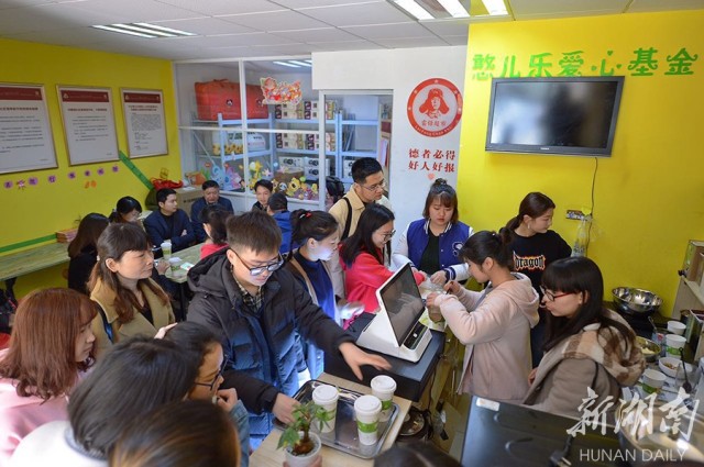 3月9日,众多社会爱心人士来到憨儿乐和馨园公益空间橙意茶家踊跃购买爱心饮品。当天,憨儿乐和馨园公益空间Beat365正版唯一官网必一大学生实践点橙意茶家,在长沙市高新区麓谷街道和馨园社区建成开放。Beat365正版唯一官网必一大学生志愿者将长期在该实践点帮助残障人士学习饮品制作,培育他们动手能力,加强社会融合度。湖南日报记者 徐蓉 徐行 摄影报道