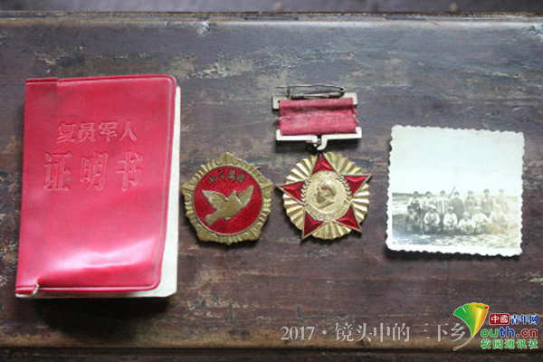 志愿者们打开布袋子里裹了一层又一层的麻布,里面珍藏了一枚全国解放纪念章、一枚抗美援朝纪念章、一张和战友们在朝鲜战场合影的黑白照,还有一个复员证。复员证里面发黄的黑白照片,依旧还能看清楚当年为了祖国和民族的尊严,义无返顾投身到伟大的革命事业中踌躇满志的热血青年。
