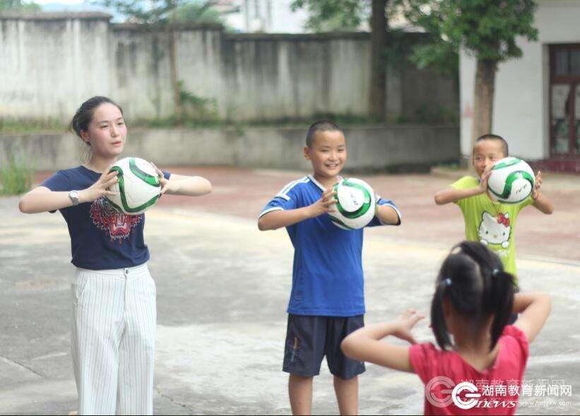 本网讯(通讯员 陈阳 谭仪 肖依婷)“一二三四五六七八,二二三四五六七八……”7月18日上午,宁乡市夏铎铺镇长龙新村龙潭小学的孩子们手中高举绿白的足球,跟着支教老师一起学做足球操,阳光闪烁在舞动的足球上,明媚着孩子们脸上的笑容。