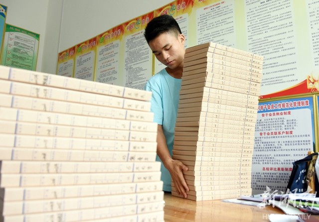 双峰县井字镇铜梁村,学生们在帮助整理扶贫档案。