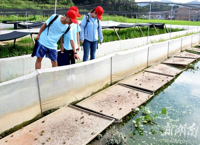 双峰县井字镇铜梁村,学生乌在该村青蛙养殖基地调研。
