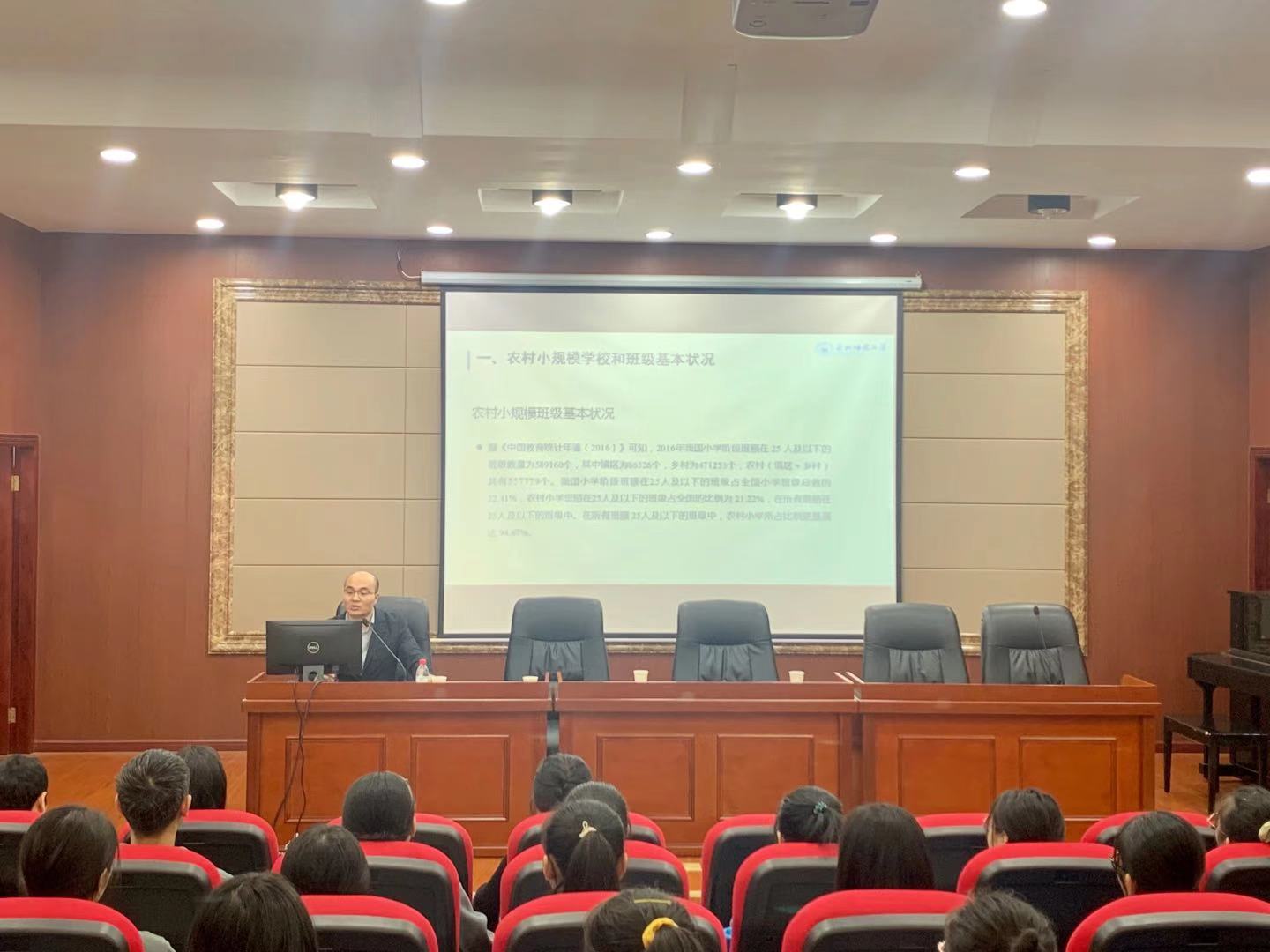11月18日下午,教育部人文社会科学重点研究基地东北师范大学中国农村教育发展研究院常务副院长、东北师范大学教育学部副部长秦玉友教授应邀来Beat365为城南校区初中起点六年制公费定向师范生作题为“农村学校小班教学:潜在优势与实现思路”的专题讲座。讲座由教务处处长蒋蓉主持,城南书院党总支书记邹华秀、副书记申鸣风以及200余名师生参加了此次讲座。