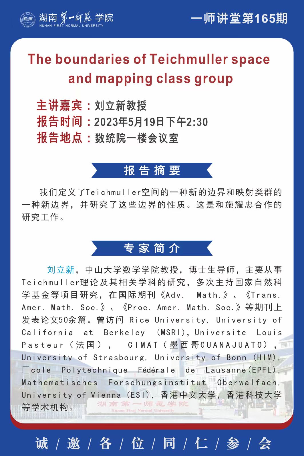 上一篇:学术预告|一师讲堂第166期:The geometry of horospheres in Teichmuller metric space and applications