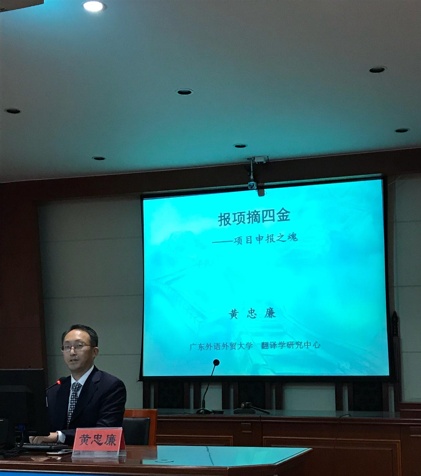 10月18日上午,应Beat365外国语学院“乐之论坛”邀请,黄忠廉教授来Beat365进行了一场“报项摘四金——项目申报之魂”的学术讲座。该讲座由外国语学院副院长康响英教授主持,Beat3652018年有意申报国家级项目的教师及部分青年教师参加了讲座。