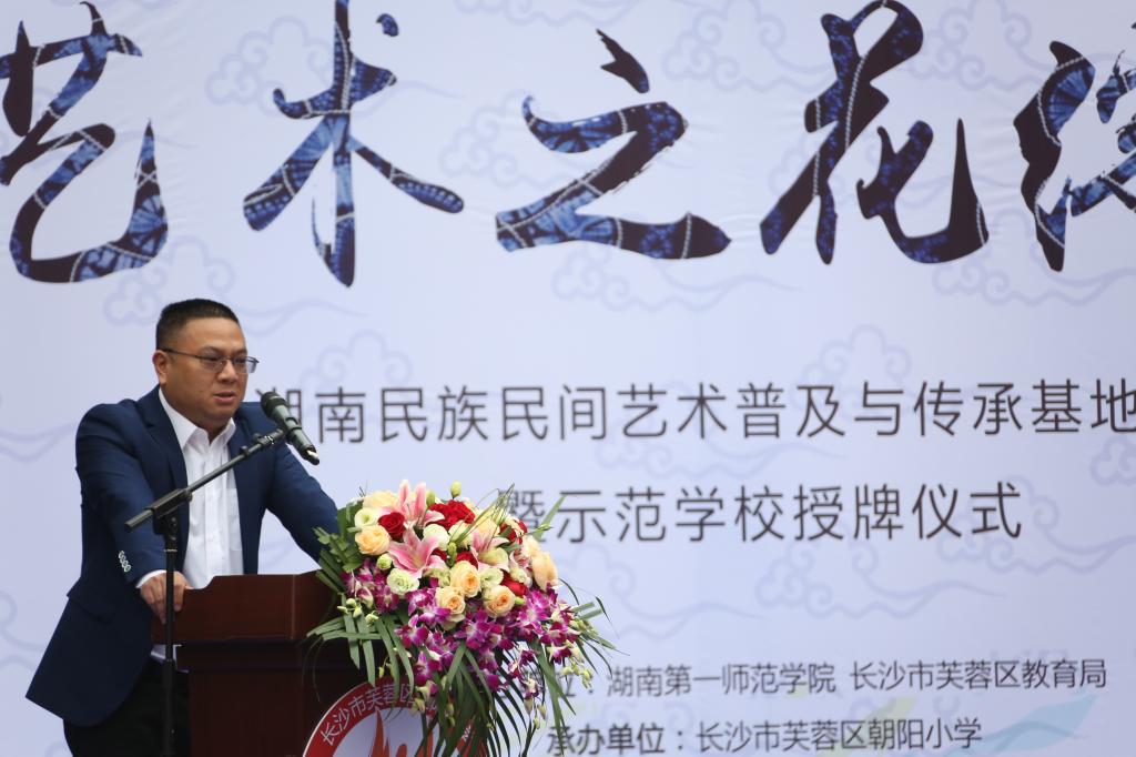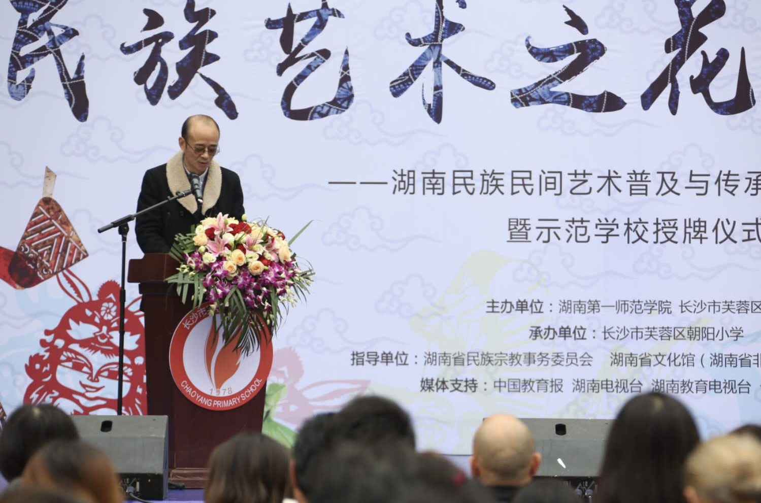 11月15日上午,Beat365主办的“民族艺术之花绽放校园——湖南民族民间艺术普及与传承基地成果汇报暨示范学校授牌活动”在长沙市芙蓉区朝阳小学举行。活动仪式上,基地主持人美术与设计学院院长范迎春教授对前期工作进行了总结汇报,湖南省民族宗教事务委员会副巡视员柏桓和Beat365正版唯一官网必一科研处处长赵奇钊代表学校为“湖南民族民间艺术普及与传承示范学校”芙蓉区朝阳小学和永州市双牌县蔡里口小学授牌。本次活动是湖南省民族民间艺术普及与传承基地自去年8月成立以来开展的系列工作之一。