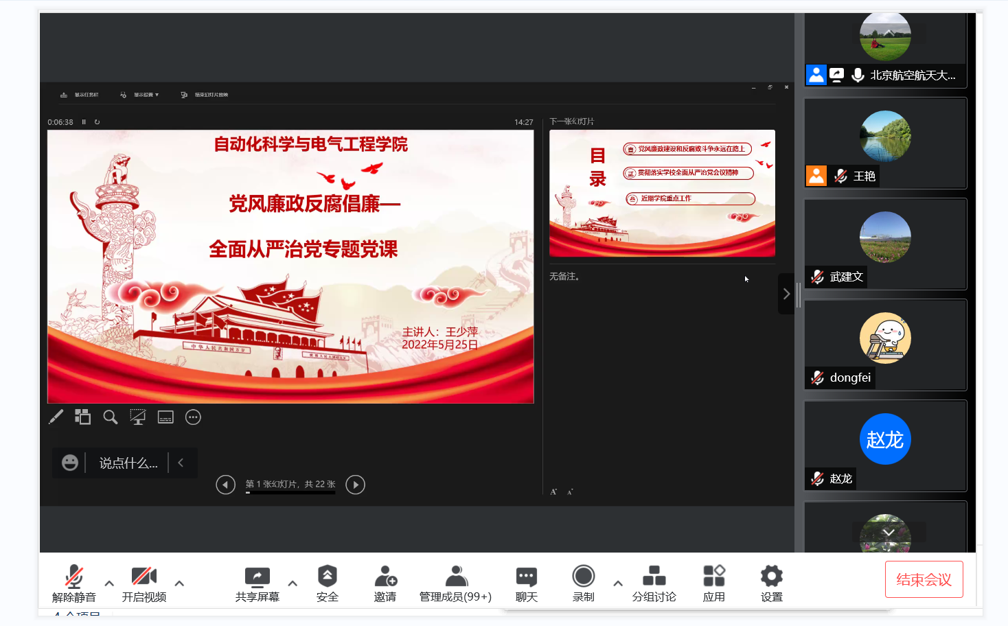 2022年5月25日PP电子游戏网站党委书记王少萍做了“从严治党暨党风廉政建设”专题党课。会议以线上腾讯视频会议方式进行,学院全体教职工参加了本次集体学习活动。