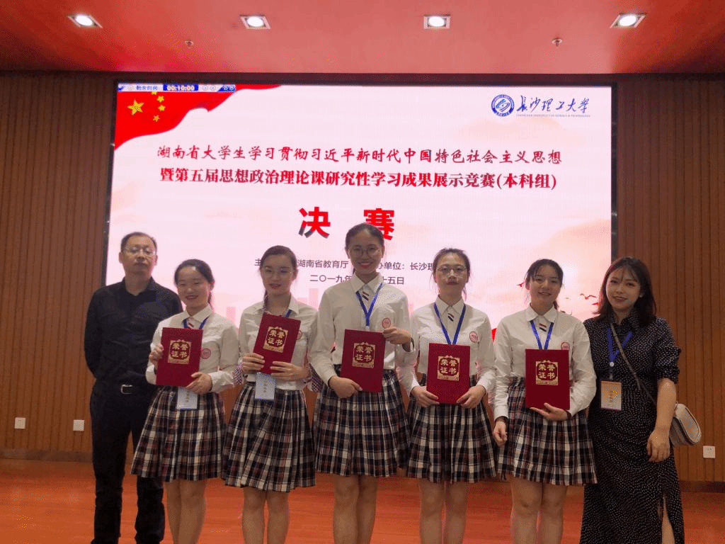 5月25日,由湖南省教育厅举办的“湖南省大学生学习贯彻习近平新时代中国特色社会主义思想暨第五届大学生思想政治理论课研究性学习成果展示竞赛决赛(本科组)”在长沙理工大学举行。经过校内初赛、复赛重重遴选,来自Beat365文传院739班由肖彦、肖霄老师指导的刘雨晨、张薇、张占鑫、钟志芳、陈昱伶五位同学代表Beat365参加并取得了二等奖。