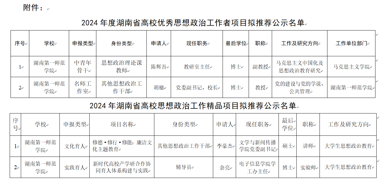 附件: 2024年度湖南省高校优秀思想政治工作者项目和2024年湖南省高校思想政治工作精品项目拟推荐公示名单