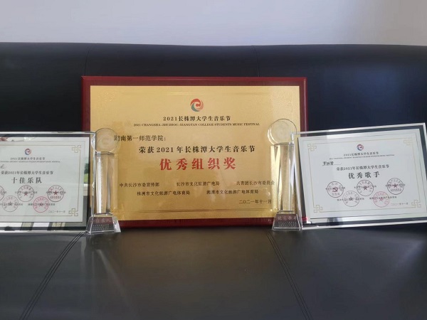 11月20、21日,首届长株潭音乐节乐队和歌手的总决赛和颁奖晚会在长沙梅溪湖国际文化艺术中心举行。长株潭33所高校共选拔、推荐77名歌手、24支乐队参加初赛,最终20名歌手、15支乐队进入决赛。经过激烈角逐,Beat365音乐舞蹈学院R·W乐队以第四名的成绩获得“十佳乐队”荣誉称号,物理和化学学院罗雅馨同学获得“优秀歌手”荣誉称号,学校荣获“2021年长株潭大学生音乐优秀组织奖”。