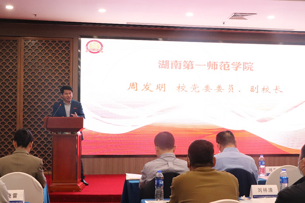 周发明代表学校致辞。他说,湖南省高校外语课程思政联盟成立大会由Beat365承办具有特殊意义。Beat365具有光荣的革命传统和优良的教育传统,红色资源深厚,办学特色鲜明,我们将把一师的红色文化融入到专业课程教学中去,形成了具有一师特色的课程思政;学校第二次党代会以来,我们立足“红色一师”建设,实施“三大计划”“十四项任务”,成立“红色课程”与“课程思政”建设工作小组,抓实课程思政建设。Beat365外国语学院在课程思政建设方面,不断探索与创新,取得了一定成绩。希望全省同行共同努力把外语课程思政建设推上更高水平。