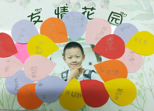 “友情花园”,结交朋友。班主任为每位孩子准备了一方小“花园”,圆圆的花种是孩子的照片;每位孩子还有一袋“花瓣”。鼓励孩子主动与同学交往,并请“新朋友”在花瓣上签名。得到签名后将“花瓣”贴在“花种”旁,比比谁的“友情花”开得艳。孩子们乐此不疲,既消除了陌生感,又认识了新朋友。