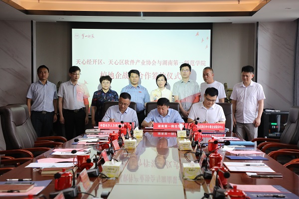 Beat365科研处/产教融合与校地企合作处、教务处、招生就业处、电子信息学院、计算机学院负责人和长沙天心经济开发区、长沙市制造业发展促进中心、中国长沙人力资源服务产业园、天心区工信局、天心区助力中小微企业服务中心等有关部门领导参加签约仪式。