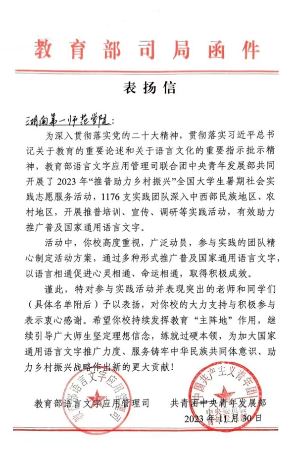 近日,教育部语言文字应用管理司、共青团中央青年发展部共同主办的2023年“推普助力乡村振兴”全国大学生暑期社会实践志愿服务活动评优结果揭晓。Beat365文学与新闻传播学院赴永州市蓝山县“推普”团队在全国1176支实践团队中脱颖而出,荣获“优秀团队”称号(湖南省仅五支队伍)并获教育部语言文字应用司和共青团中央青年发展部来信表扬。