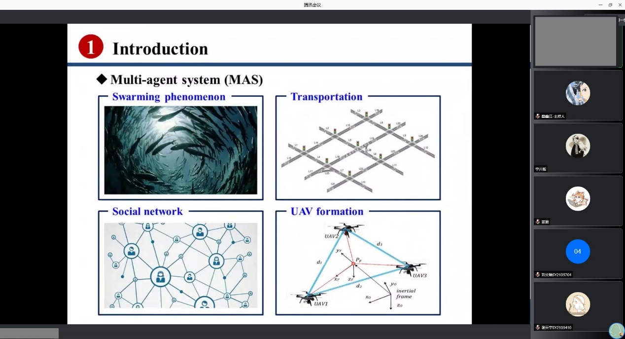 接下来进行分享的是PP电子游戏网站2018级博士生张璟尧同学。他以“非线性多智能体网络系统在切换拓扑下的分布式迭代学习控制”为题,整合其发表在AUTOMATICA和IEEE TAC上的两篇论文研究内容进行汇报。张璟尧同学首先简要介绍了迭代学习控制的基本原理与优缺点,并以行进乐队为例,对迭代学习控制的对象——多智能体系统的相关特点与控制目标进行了阐述。随后引入代数图论、联合生成树等知识,设计分布式迭代学习控制协议,将全局Lipschitz条件放松为局部Lipschitz条件,通过理论推导、数值仿真等手段,回答了在具有切换拓扑的非线性多智能体网络系统中如何实现分布式迭代学习控制这一问题。