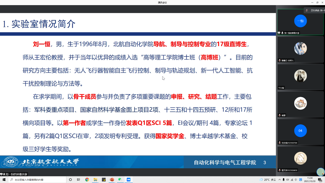 刘一恒同学是PP电子游戏网站2017级博士研究生,师从王宏伦教授。汇报开始,刘一恒同学简要介绍了个人信息与课题组概况,随后围绕“无人机软式空中对接与回收抗扰动快速精准控制技术研究”,从“无人机空中对接与回收控制”、“高超智能制导与控制技术”、“无人机自主空中加油对接控制技术”、“飞行器空中态势感知与自主避撞技术”、“运载火箭上面级智能在线重规划技术”五个方面展开介绍,明确阐述了研究工作的重要性与难点,并通过大量图表、仿真结果、实验结果,直观地展示了其在博士期间丰富的科研成果。最后,刘一恒同学分享了自己在多年科研生活中总结出的宝贵经验,强调了明确研究方向、提前做好未来发展规划的重要性,分析了项目与科研的互补作用,也叮嘱大家要注意身体、健康生活。
